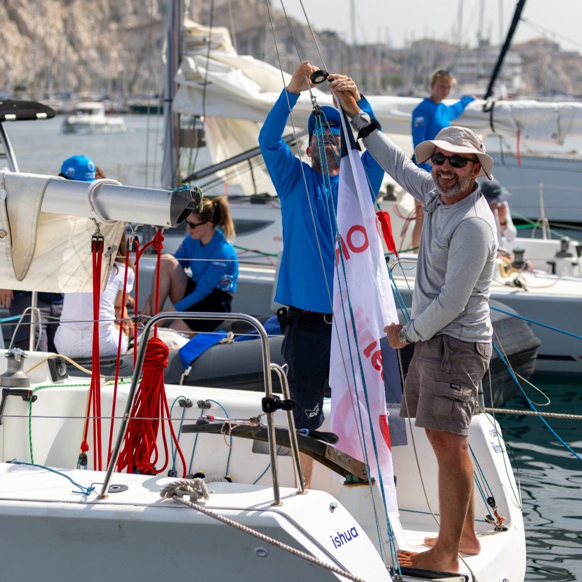 - Soit avoir 6 membres d'équipages sur le bateau, et 6 accompagnants sur le Frioul (collaborateurs, conjoint-e, etc)